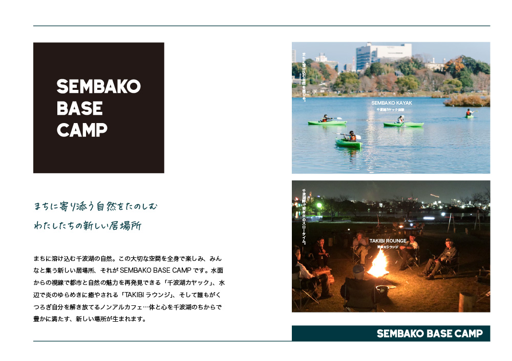 まちに溶け込む千波湖の自然。この大切な空間を全身で楽しみ、みんなと集う新しい居場所、それがSEMBAKO BASE CAMPです。