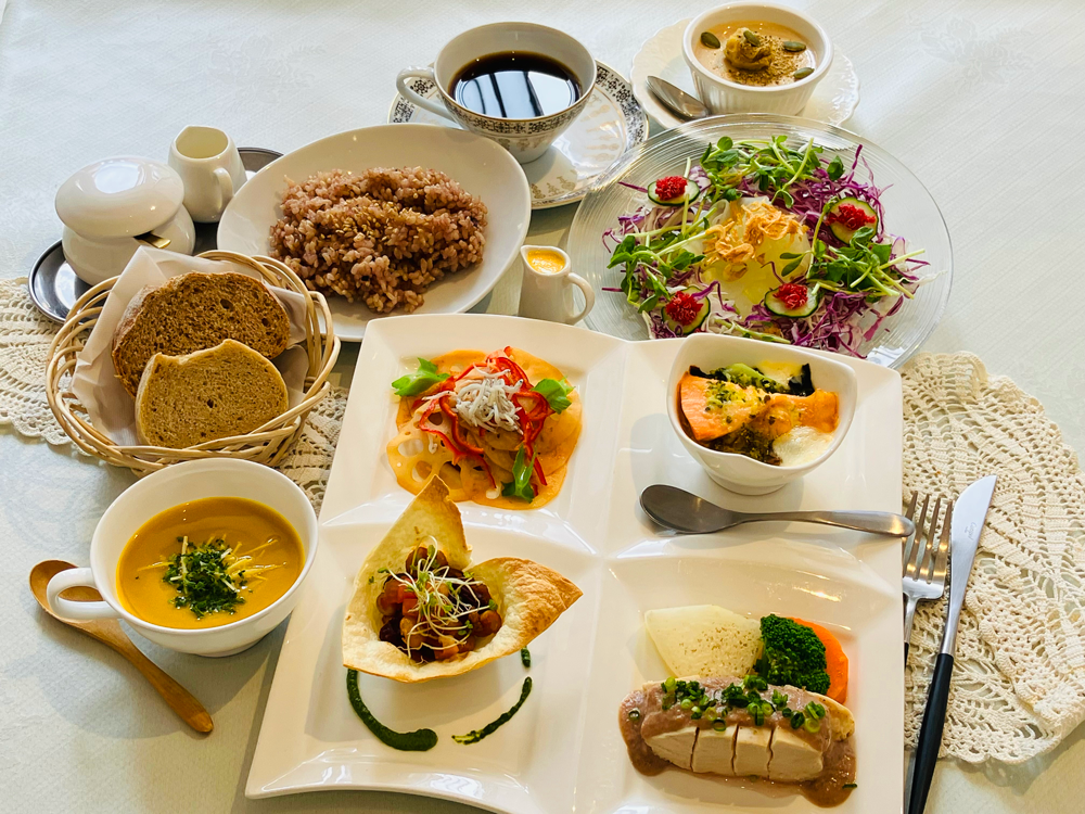 看板メニューの「30品目バランスプレート」をはじめ、常陸牛や季節ごとの特別メニューなど、体にも心にもやさしいコース料理をご用意しております。