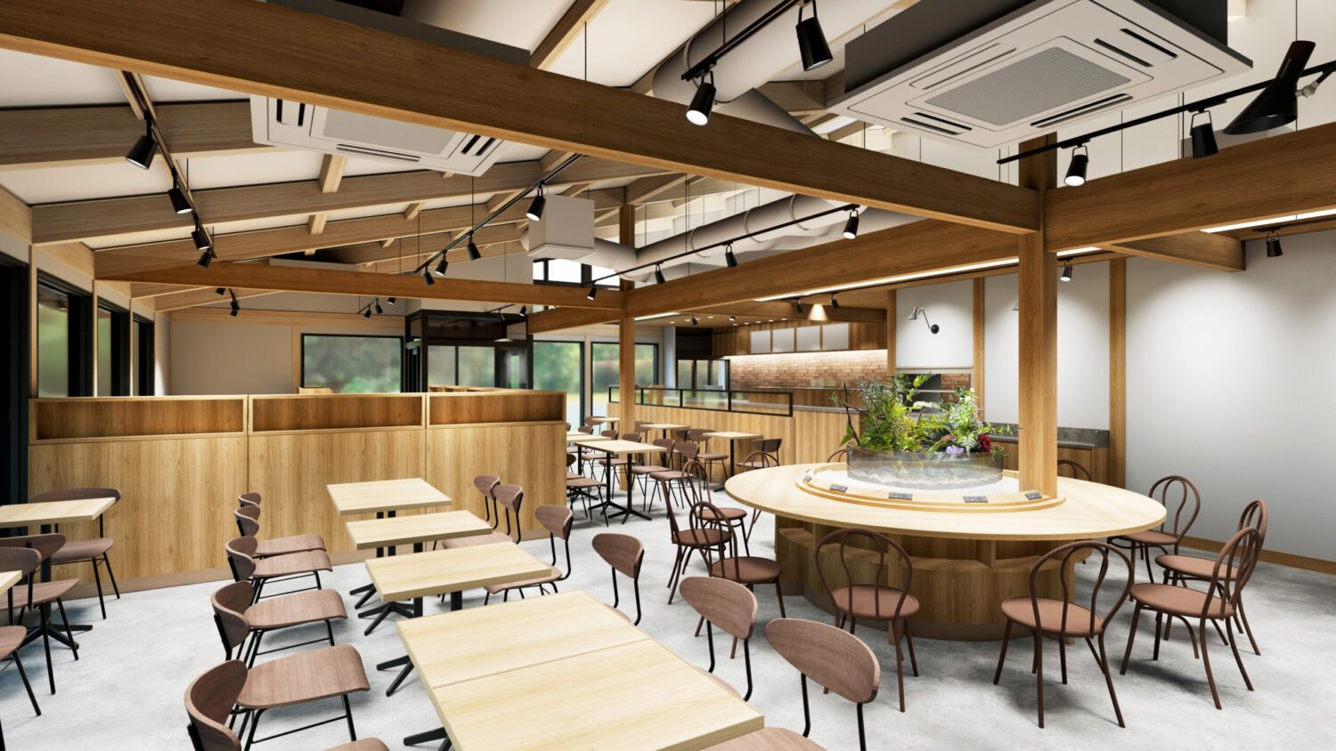 「人と生物と自然の共存」をテーマに、「公園に集うすべての方々に、心地の良いひと時を」をショップコンセプトに、愛犬と飼い主が一緒にくつろげるドッグカフェエリアと一般カフェエリアをパーテーションで区分けし、愛犬家の方も、犬が苦手な方も、どちらも心地よくお過ごしいただける店舗にしています。