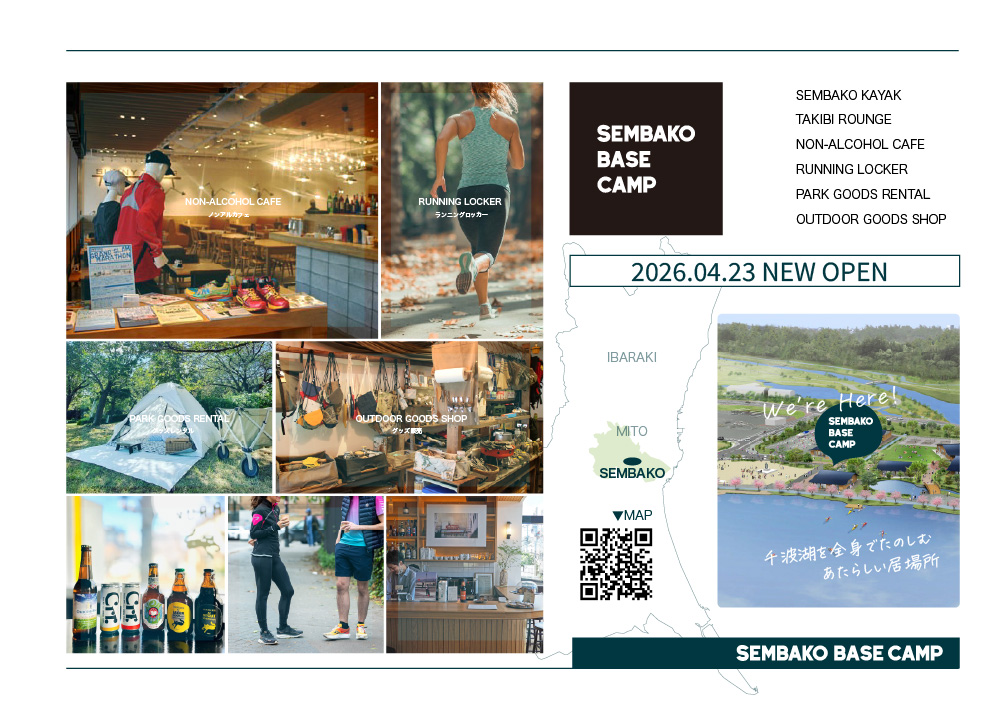 水面からの視線で都市と自然の魅力を再発見できる「千波湖カヤック」、水辺で炎のゆらめきに癒される「焚火ラウンジ」、そして誰もがくつろぎ一人でも仲間とでも楽しめるノンアルカフェ、公園を家族や仲間とより快適に楽しむ為のパークグッズレンタル、千波湖で走るランナーがちょっとした荷物を置いておけるランニングロッカー、アウトドアやペット好きに嬉しい雑貨小物ショップなど、公園をとことん楽しむための場所です。